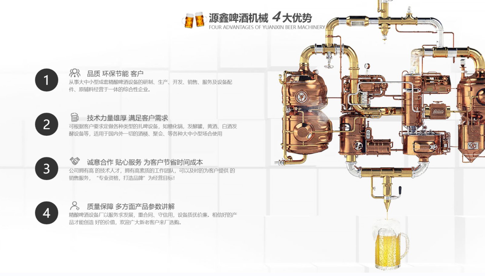 南陽市源鑫啤酒機械設(shè)備有限公司位于歷史文化名城一-南陽,從事大中小型成套啤酒、白酒自釀設(shè)備的研制、生產(chǎn)、開發(fā)、銷售、服務(wù)及設(shè)備配件、原輔料經(jīng)營于一體的綜合性企業(yè)。公司可根據(jù)客戶要求定做各種類型的扎啤設(shè)備,如糖化鍋,發(fā)酵罐,黃酒、白酒發(fā)酵設(shè)備等,適用于國內(nèi)外一切的酒樓、餐廳、家庭.聚會、酒吧等各種大、中、小型場合使用。公司擁有技術(shù)人才,擁有高素質(zhì)的工作團(tuán)隊,可以及時的為客戶提供**的銷售服務(wù)。公司以“專業(yè)資格,打造品牌”為經(jīng)營目標(biāo),“卓越質(zhì)量,信賴價格”為經(jīng)營宗旨,以質(zhì)量求生存,以服務(wù)求發(fā)展,重合同、守信用,設(shè)備質(zhì)優(yōu)價廉。相信好的產(chǎn)品才能創(chuàng)造 好的價值,歡迎廣大新老客戶來廠選購。...